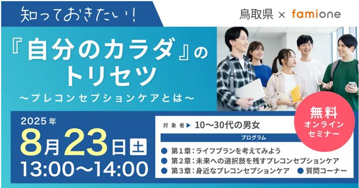 鳥取県のプレコンセプションケア推進事業の一環として、ファミワンは「知っておきたい!『自分のカラダ』のトリセツ~プレコンセプションケアとは~」を2025年8月23日に開催します。このセミナーが、鳥取県の県政テレビ番組『キニナルとっとり+』(https://www.bss.jp/kininaru/entry.html)で紹介されました。