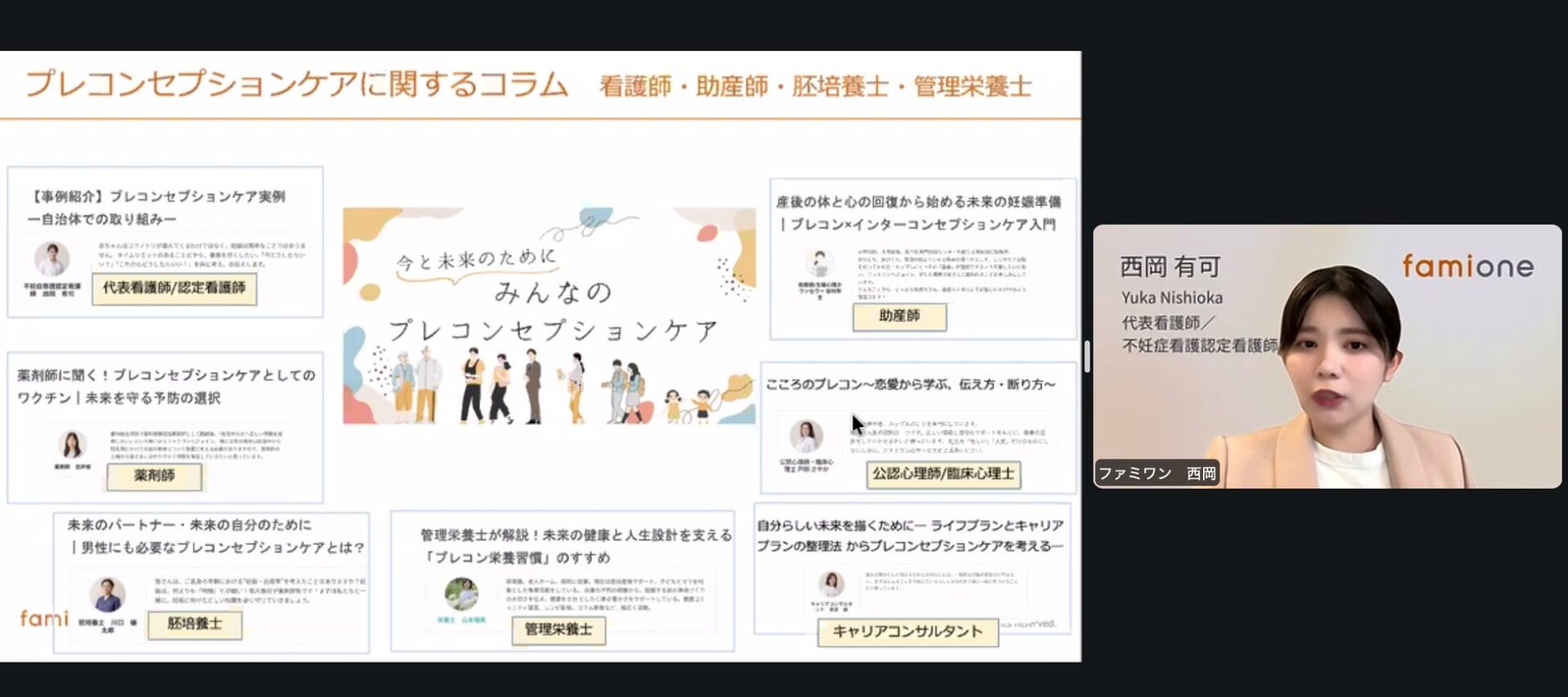 後半パートでは、ファミワンの執行役員・不妊症看護認定看護師 西岡有可が、自治体と連携して進めてきたプレコンセプションケア施策の具体的な事例を紹介。