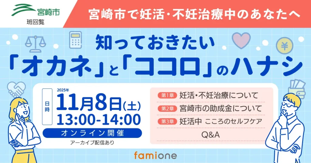 宮崎市での「妊活サポート事業」の一環として、妊活・不妊治療中の方に向けた無料のオンラインセミナーを、11月8日に開催します