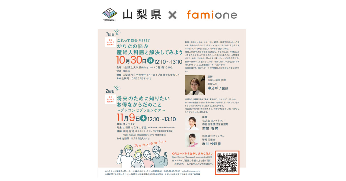 山梨県主催のプレコンセプションケアセミナーを県内大学生向けに全2回で開催します