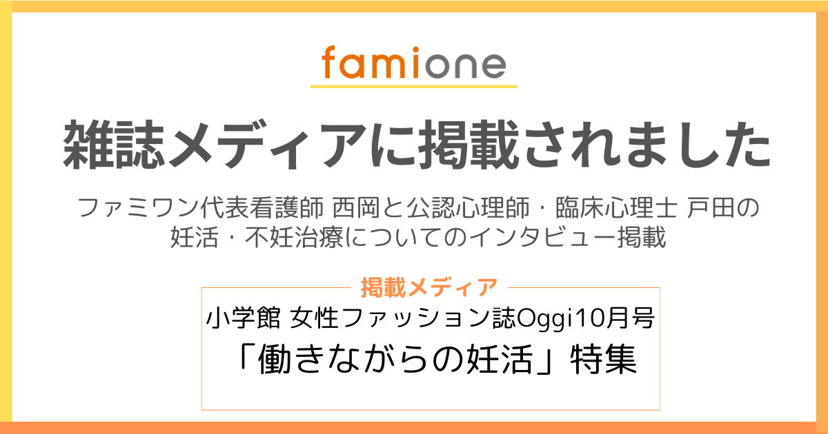 「Oggi」10月号の特集記事「働きながらの妊活2025」に、ファミワン代表看護師 西岡と公認心理師・臨床心理士 戸田がインタビュー協力しました