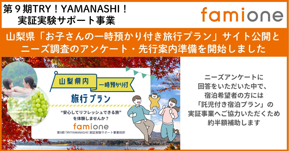 山梨県の「TRY!YAMANASHI!実証実験サポート事業」に採択された『一時託児付き旅行プラン』のサイト公開と先行登録を開始