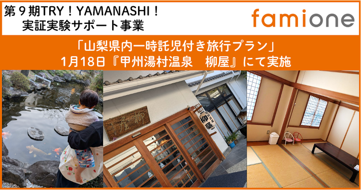 希望者募集中の山梨県内「一時託児付き旅行プラン」を、『甲州湯村温泉 柳屋』と3組のご家族様にて実証を行いました